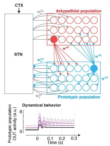 This biomarker has been thoroughly studied in past years: It has been identified across structures, and exploited to engineer the first generation of closed-loop Deep Brain Stimulation (DBS) therapies. However the connectivity origins that give rise to such oscillations are still unclear, and the time evolution of neural processes leading up to such synchrony are unknown. GOAL. We are pursuing the development of neural models of key populations in the basal ganglia, together with machine learning-based decoders, in order to understand and predict the origin (and time evolution) of oscillatory patterns. These model-based predictors hold the potential to allow more precise targetting of pathological signatures with DBS, hence reducing side-effects and improving battery life.