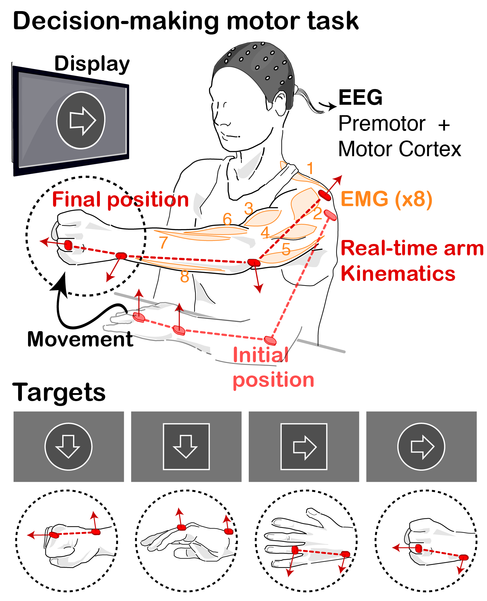 MOTIVATION. Decision-Making studies commonly deal with finite (often binary), well-defined sets of choices. Instead, motor control is traditionnally concerned with continuous, high-dimensional spatiotemporal patterns of kinematic and kinetic changes that give rise to coordinated multi-joint movements. As a result of these dichotomies, the link between these two fields has remained largely unexplored, even though this understanding might be pivotal for the translation of existing theories and models of action selection to the study of motor dysfunction in neurological movement disorders, such as rigidity or bradykinesia.