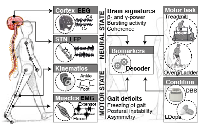 GOAL. We are combining a high-resolution tracking platform established at CHUV, with unique equipment for recording and modulating gait wirelessly and in real-time , in order to map the activity of subthalamic nucleus and cortical networks onto kinematic, kinetic, and muscle activity patterns while patients execute a range of activities of daily living.